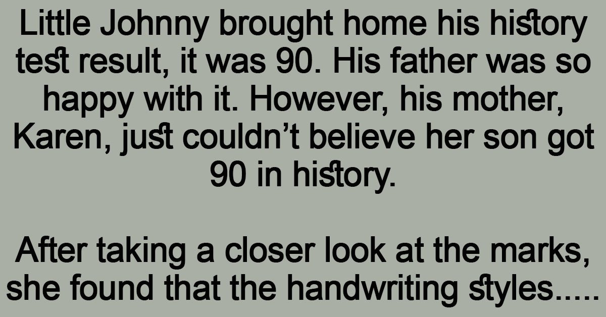Little Johnny brought home his history test result, it was 90. His father was so happy with it. However, his mother, Karen, just couldn’t believe her son got 90 in … …