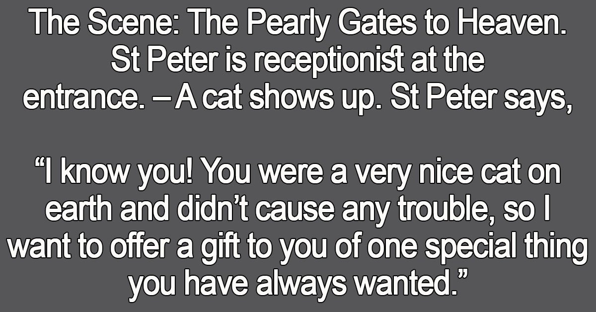 The Scene: The Pearly Gates to Heaven. St Peter is receptionist at the entrance. – A cat shows up. St Peter says “I know you! You were a very nice … …