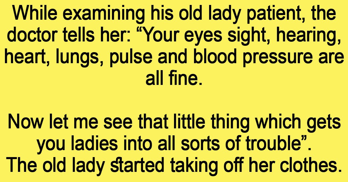 While examining his old lady patient, the doctor tells her: “Your eyes sight, hearing, heart, lungs, pulse and blood pressure are all fine. Now let me see that little thing … …