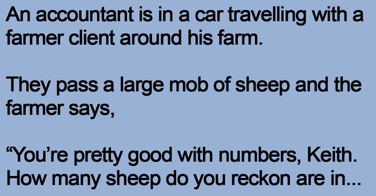 An accountant is in a car travelling with a farmer client around his farm. They pass a large mob of sheep and the farmer says, “You’re pretty good with numbers, … …