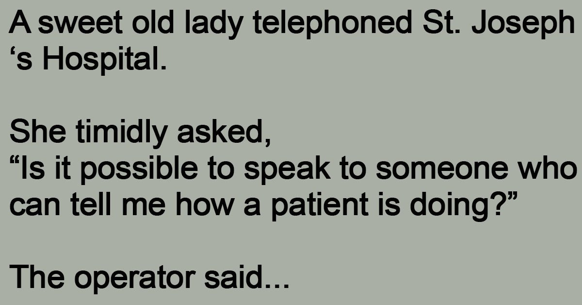 A sweet old lady telephoned St. Joseph ‘s Hospital. She timidly asked, “Is it possible to speak to someone who can tell me how a patient is doing?” The operator … …