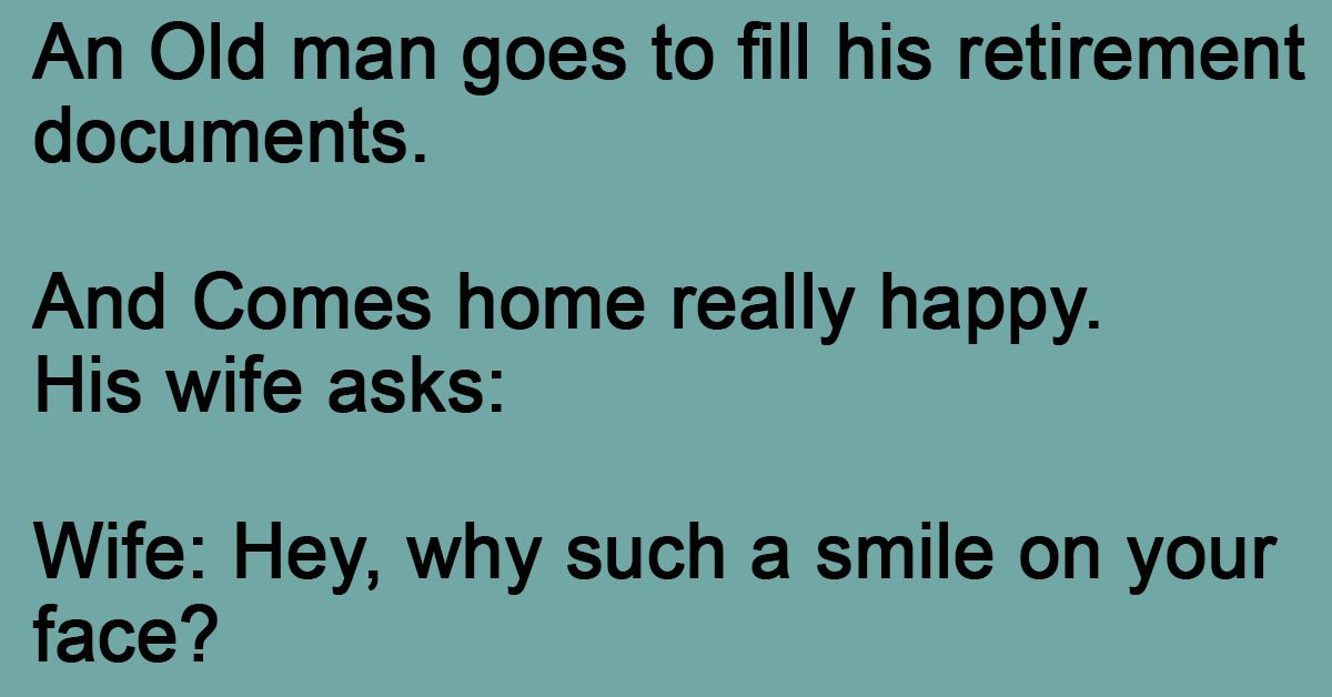 An Old man goes to fill his retirement documents. And Comes home really happy. His wife asks: Wife: Hey, why such a smile on your face? Husband: Can you imagine? … …