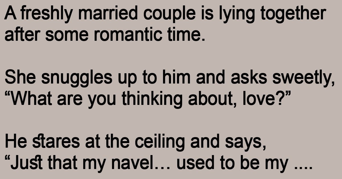 A freshly married couple is lying together after some romantic time. She snuggles up to him and asks sweetly, “What are you thinking about, love?” He stares at the … …