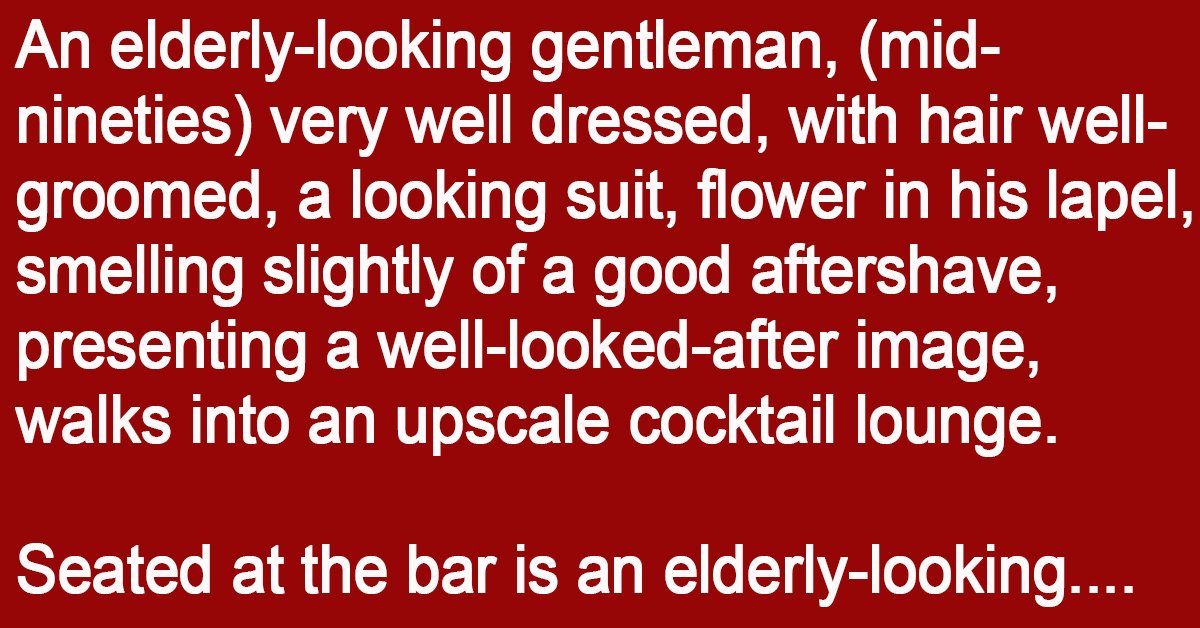 An elderly-looking gentleman, (mid-nineties) very well dressed, with hair well-groomed, a looking suit, flower in his lapel, smelling slightly of a good aftershave, presenting a well-looked-after image, walks into … …