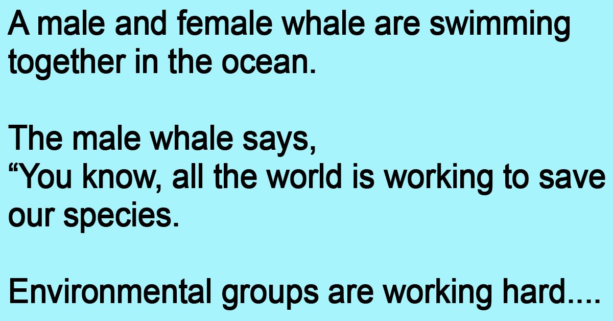 A male and female whale are swimming together in the ocean. The male whale says, “You know, all the world is working to save our species. Environmental groups are … …