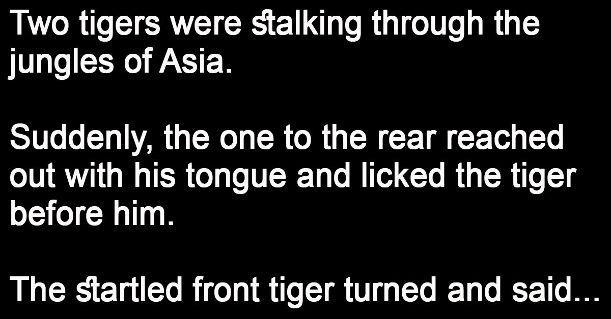 Two tigers were stalking through the jungles of Asia. Suddenly, the one to the rear reached out with his tongue and licked the tiger before him. The startled front … …