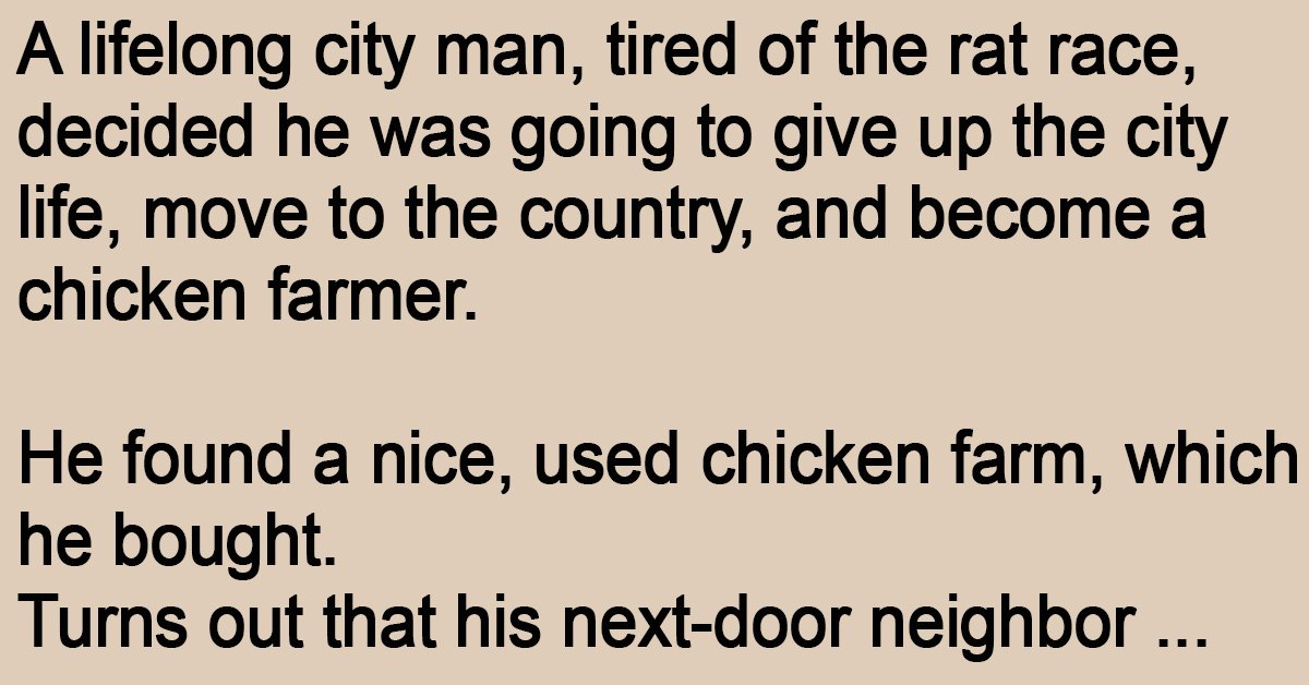 A lifelong city man, tired of the rat race, decided he was going to give up the city life, move to the country, and become a chicken farmer. He … …