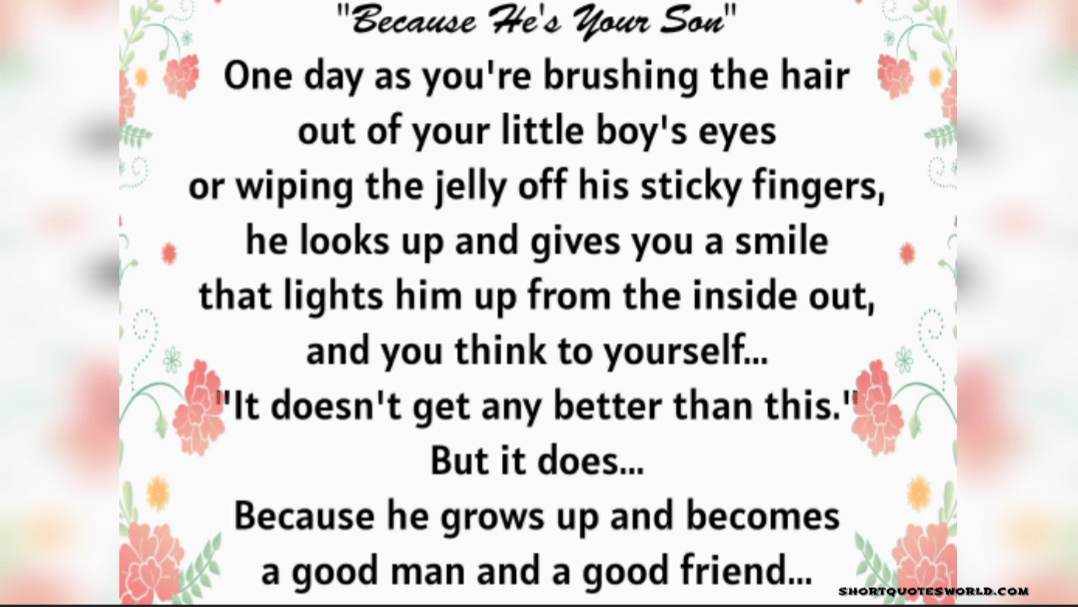 “Because He’s Your Son” One day as you’re brushing the hairout of your little boy’s eyes or wiping the jelly off his sticky fingers, he looks up and gives you a smile that lights him up from the inside out, and you think to yourself…”It doesn’t get any better than this. “But it does…Because he grows up and becomes a good man and a good friend… and his smile still lights up your world.