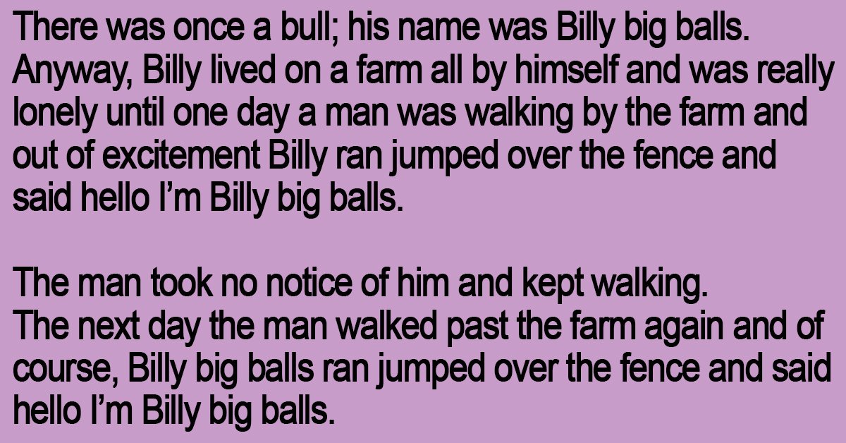 Anyway, Billy lived on a farm all by himself and was really lonely until one day a man was walking by the farm and out of excitement Billy ran jumped over the fence and said hello I’m Billy big balls.