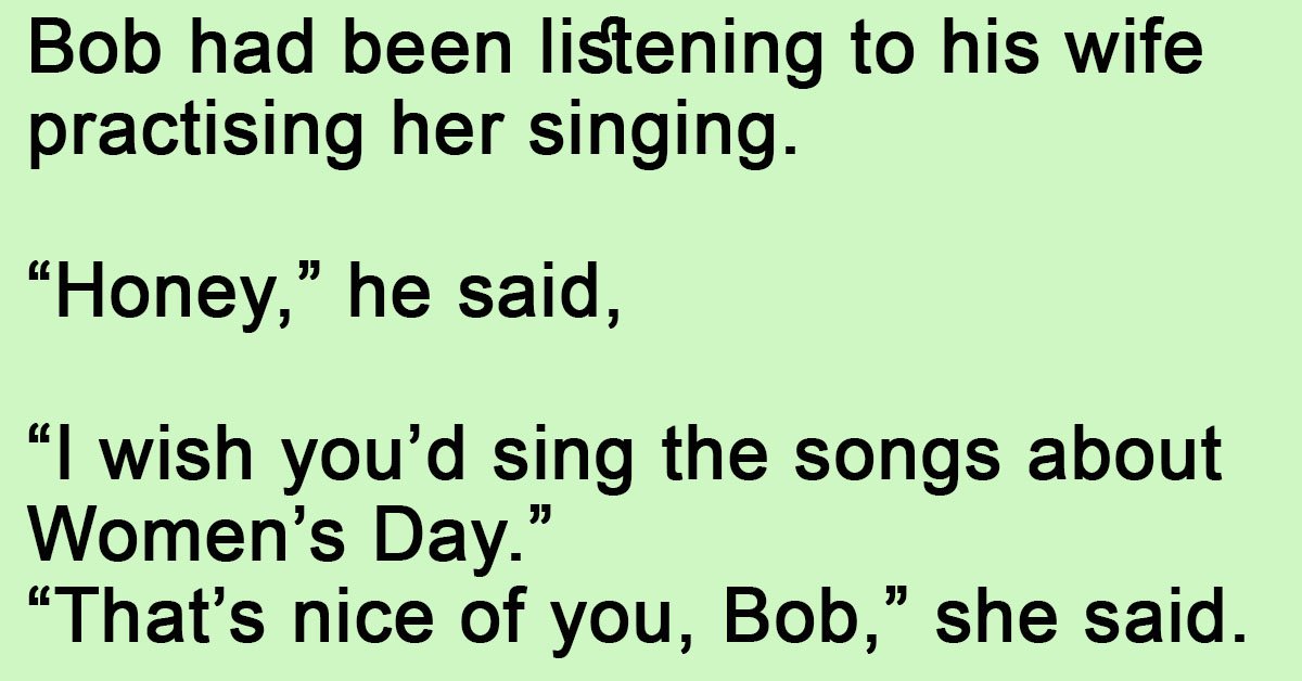 Bob Had Been Listening To His Wife Practicing Her Singing. August 24, 2023 by Kevin Adams Facebook Twitter Pinterest LinkedInBob had been listening to his wife practising her singing. “Honey,” he said, “I wish you’d sing the songs about Women’s Day.” “That’s nice of you, Bob,” she said. “Why?” “Then I’d only have to hear you once a year!” Facebook Twitter Pinterest LinkedIn