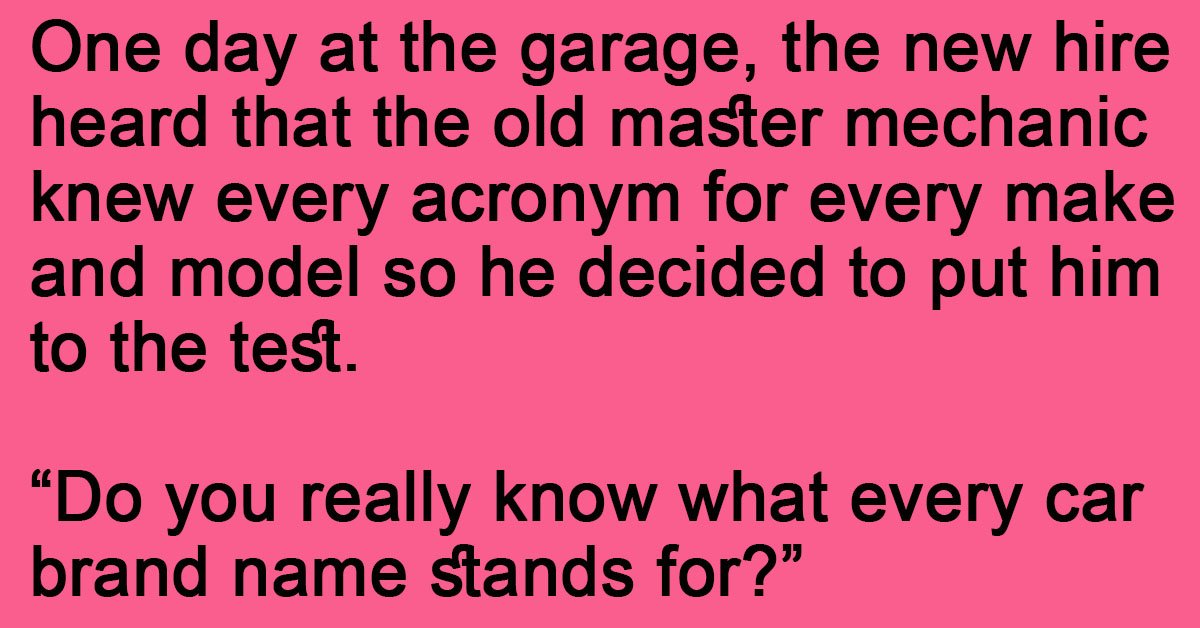 One day at the garage, the new hire heard that the old master mechanic knew every acronym for every make and model so he decided to put him to the … …