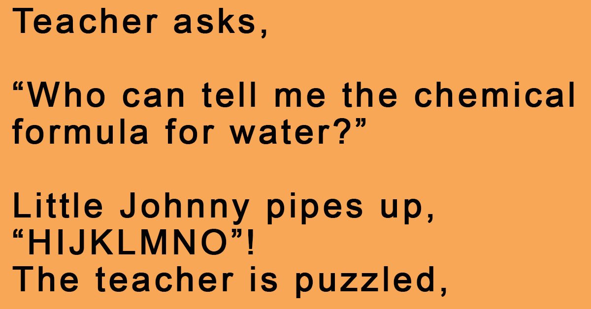 Teacher asks, “Who can tell me the chemical formula for water?” Little Johnny pipes up, “HIJKLMNO”! The teacher is puzzled, “What on Earth are you talking about, Johnny?” Little Johnny … …