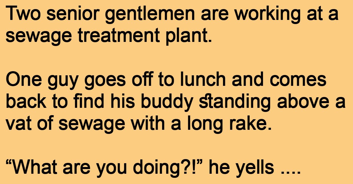 Two senior gentlemen are working at a sewage treatment plant. One guy goes off to lunch and comes back to find his buddy standing above a vat of sewage … …