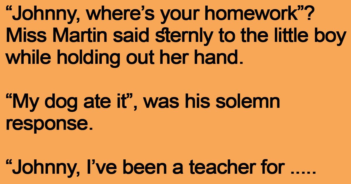 “Johnny, where’s your homework”? Miss Martin said sternly to the little boy while holding out her hand. “My dog ate it”, was his solemn response. “Johnny, I’ve been a … …