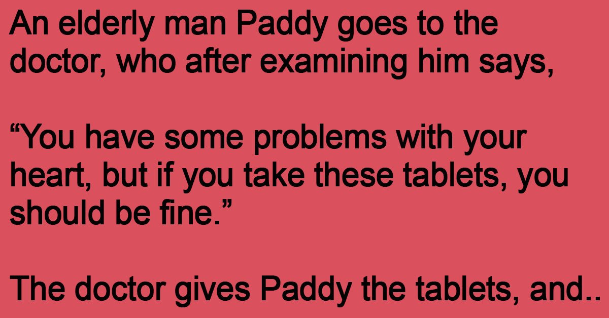 An elderly man Paddy goes to the doctor, who after examining him says, “You have some problems with your heart, but if you take these tablets, you should be … …