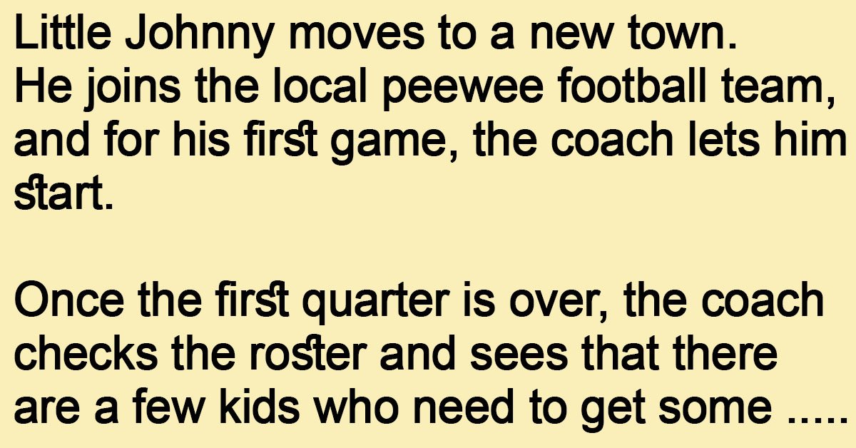 Little Johnny moves to a new town. He joins the local peewee football team, and for his first game, the coach lets him start. Once the first quarter is … …