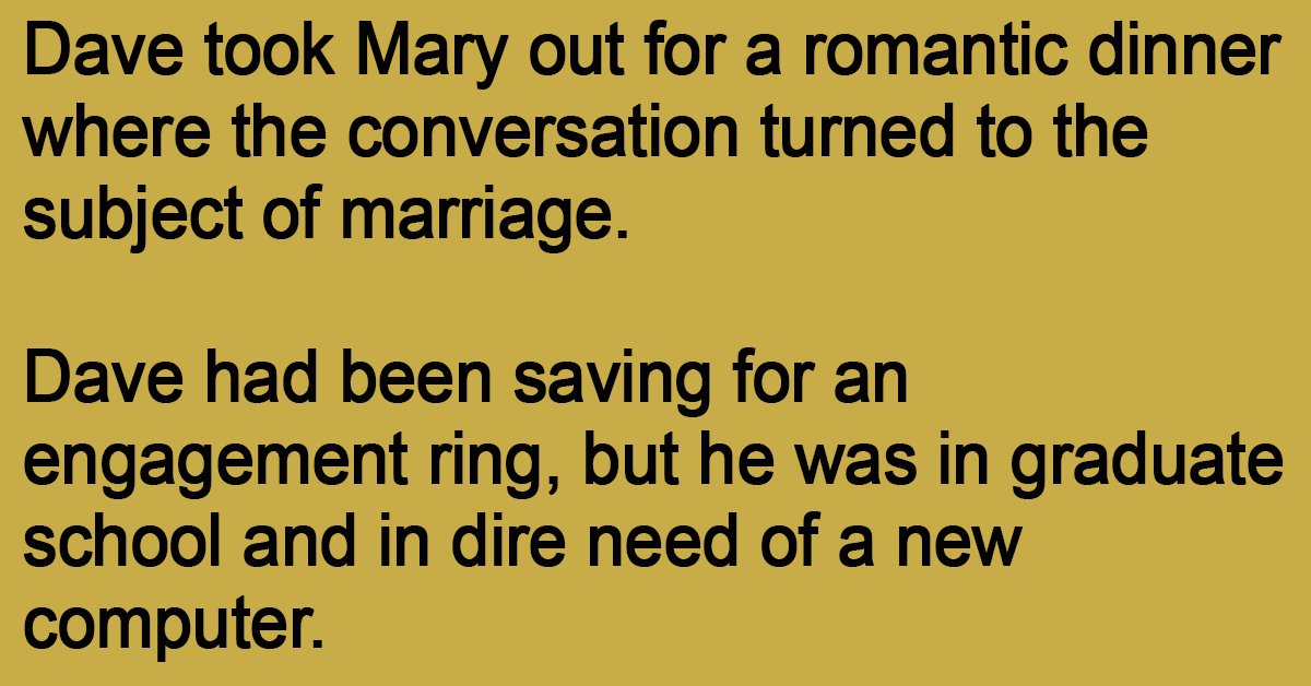 Dave had been saving for an engagement ring, but he was in graduate school and in dire need of a new computer.
