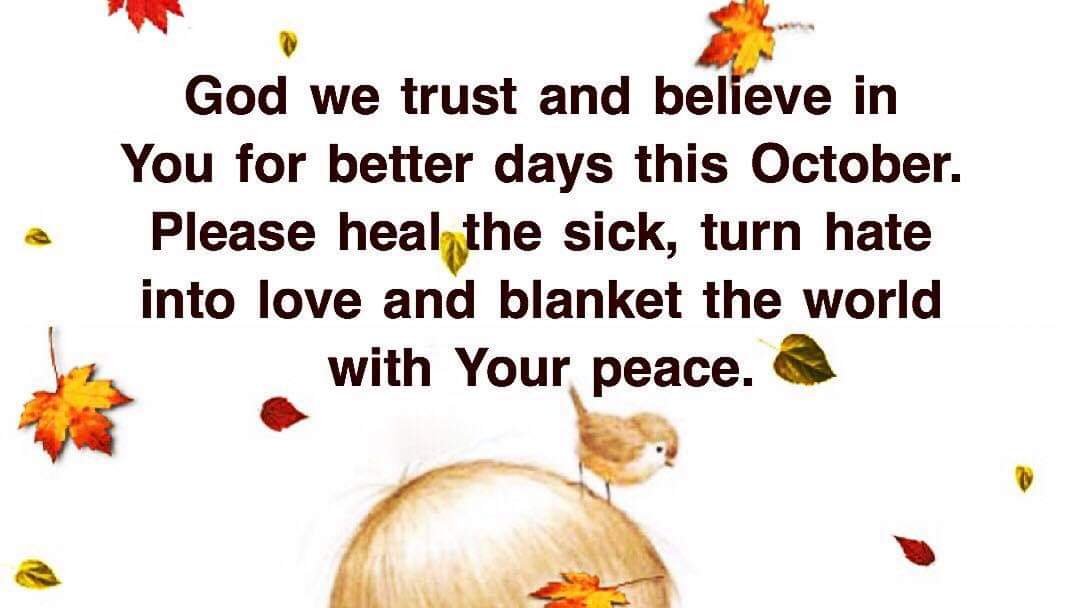 God we trust and believe inYou for better days this October.Please heal the sick, turn hateinto love and blanket the worldwith Your peace.
