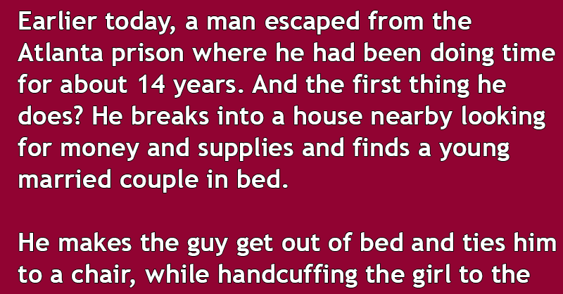 Earlier today, a man escaped from the Atlanta prison where he had been doing time for about 14 years. And the first thing he does? He breaks into a house nearby looking for money and supplies and finds a young married couple in bed.