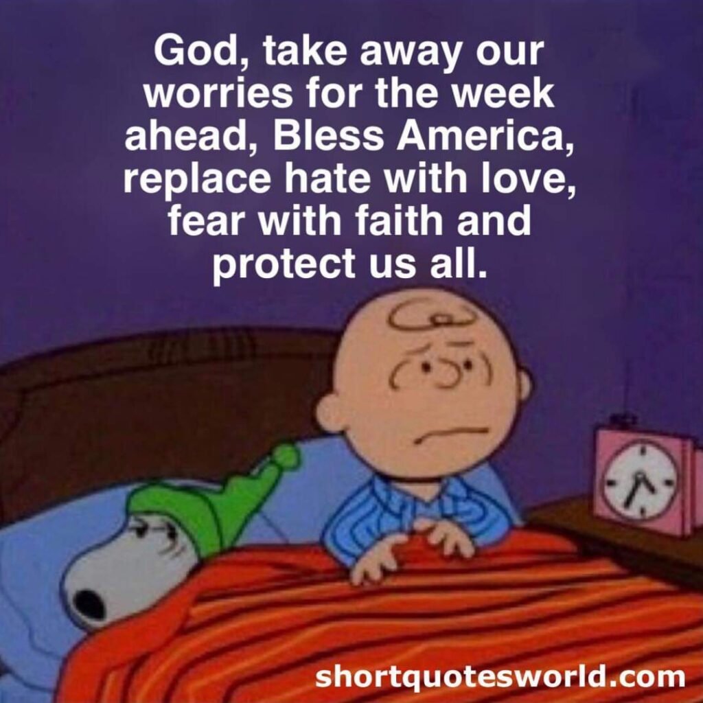 God, take away our worries for the week ahead, Bless America, replace hate with love, fear with faith and protect us all.