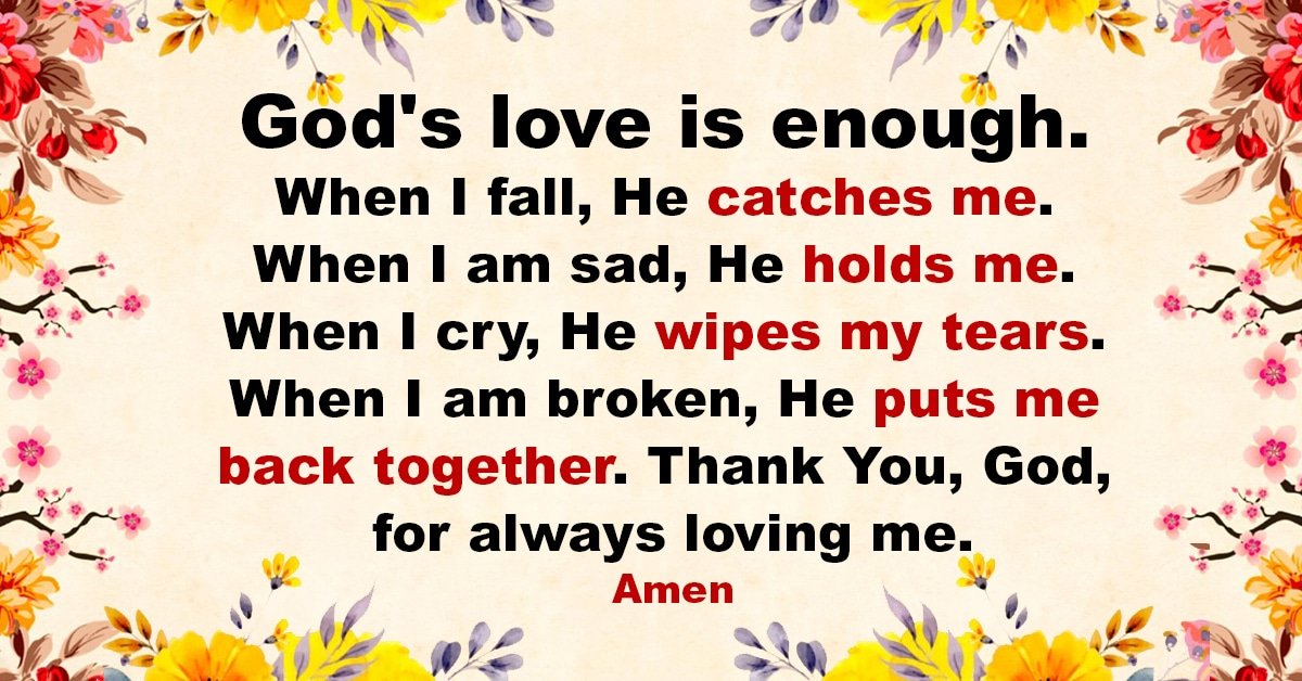 10. God’s love is enough. When I fall, He catches me. When I am sad, He holds me. When I cry, He wipes my tears. When I am broken, He puts me back together. Thank You, God, for always loving me.