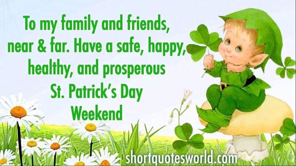 To all my family and my friends, near and far. Even though I might not see you or talk to you everyday, you are always in my heart and in my thoughts. I am sending a greeting to wish you and yours a very safe, happy, healthy and prosperous St. Patrick’s Day Weekend. May your troubles be less and your blessings be more and nothing but happiness come through your door. May love and laughter light your days and fill your heart and home. May good and faithful friends be yours wherever you may roam. May peace and plenty bless your world with joy that long endures. May all life’s passing seasons bring the best to you and yours!