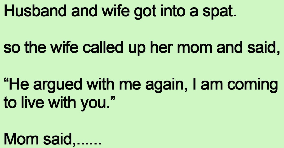 Husband And Wife Got Into A Spat. March 29, 2024 by petly team Facebook Twitter Pinterest LinkedInHusband and wife got into a spat. so the wife called up her mom and said, “He argued with me again, I am coming to live with you.” Mom said, “No darling, he must pay for his mistake. I am coming to live with you”. Facebook Twitter Pinterest LinkedIn