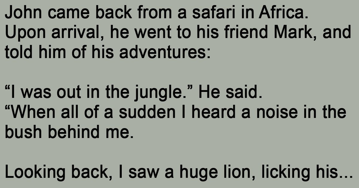 Looking back, I saw a huge lion, licking his chops, and smiling at me.