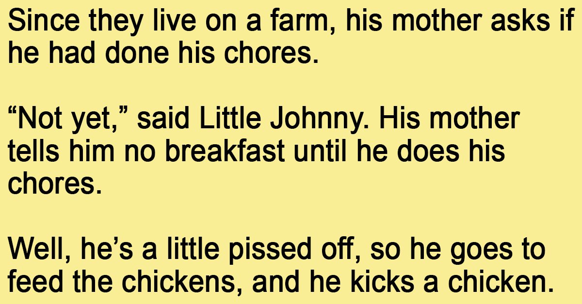 Just then, his father comes down for breakfast and kicks the cat halfway across the kitchen. Little Johnny looks up at his mother with a smile and says: