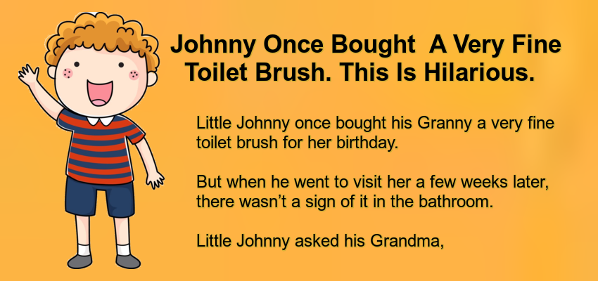 Johnny Once Bought A Very Fine Toilet Brush. – June 10, 2022 by Kevin Adams Facebook Twitter Pinterest LinkedIn Little Johnny once bought his Granny a very fine toilet brush for her birthday. But when he went to visit her a few weeks later, there wasn’t a sign of it in the bathroom. Little Johnny asked his Grandma, “Granny, what happened to the loo brush I gave you?” “Darling, I really didn’t like it. After all those years, I’ve gotten used to the toilet paper, and this new thing was just far too scratchy.” Facebook Twitter Pinterest LinkedIn