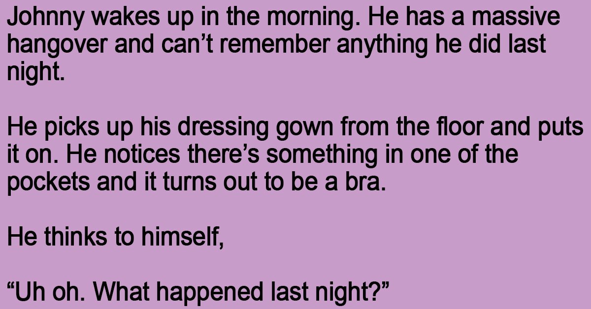 He picks up his dressing gown from the floor and puts it on. He notices there’s something in one of the pockets and it turns out to be a bra.