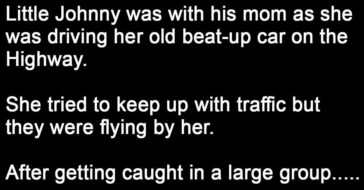 Little Johnny was with his mom as she was driving her old beat-up car on the Highway.