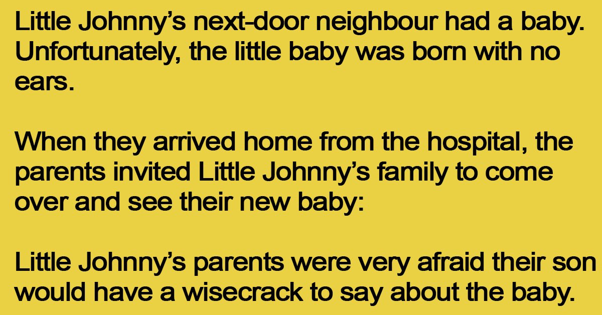 “Now, son, that poor baby was born without any ears. I want you to be on your best behaviour and not say one word about his ears, or I’m really going to spank your butt when we get back home.”