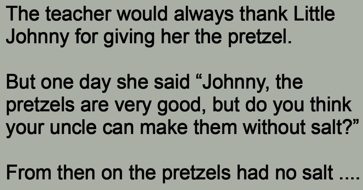 After a few days the teacher felt she was making it hard for Johnny’s uncle to make pretzels without salt especially for her so she said to Johnny “Little Johnny, I hope it’s not too much work for your uncle to make pretzels without salt for me?”