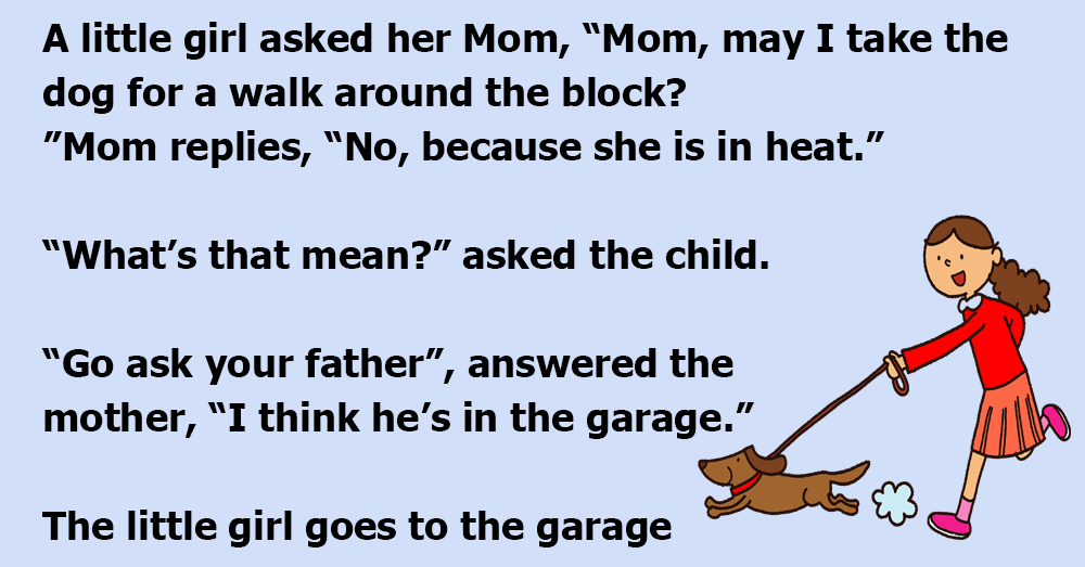 The little girl goes to the garage and says, “Dad, may I take Belle for a walk around the block? I asked Mom, but she said the dog was in heat, and to come to you.”
