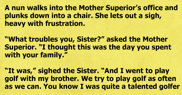 “It was,” sighed the Sister. “And I went to play golf with my brother. We try to play golf as often as we can. You know I was quite a talented golfer before I devoted my life to Christ.”