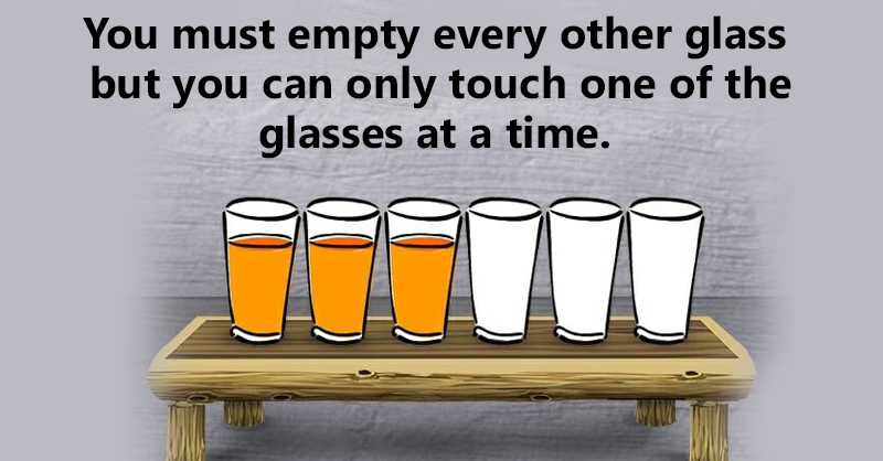 The challenge itself is the following: you must empty every other glass – but you can only touch one of the glasses at a time. Below we can see the picture.
