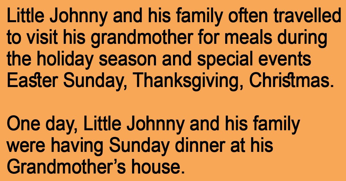 Little Johnny and his family often travelled to visit his grandmother for meals during the holiday season and special events Easter Sunday, Thanksgiving, Christmas. One day, Little Johnny and his … …