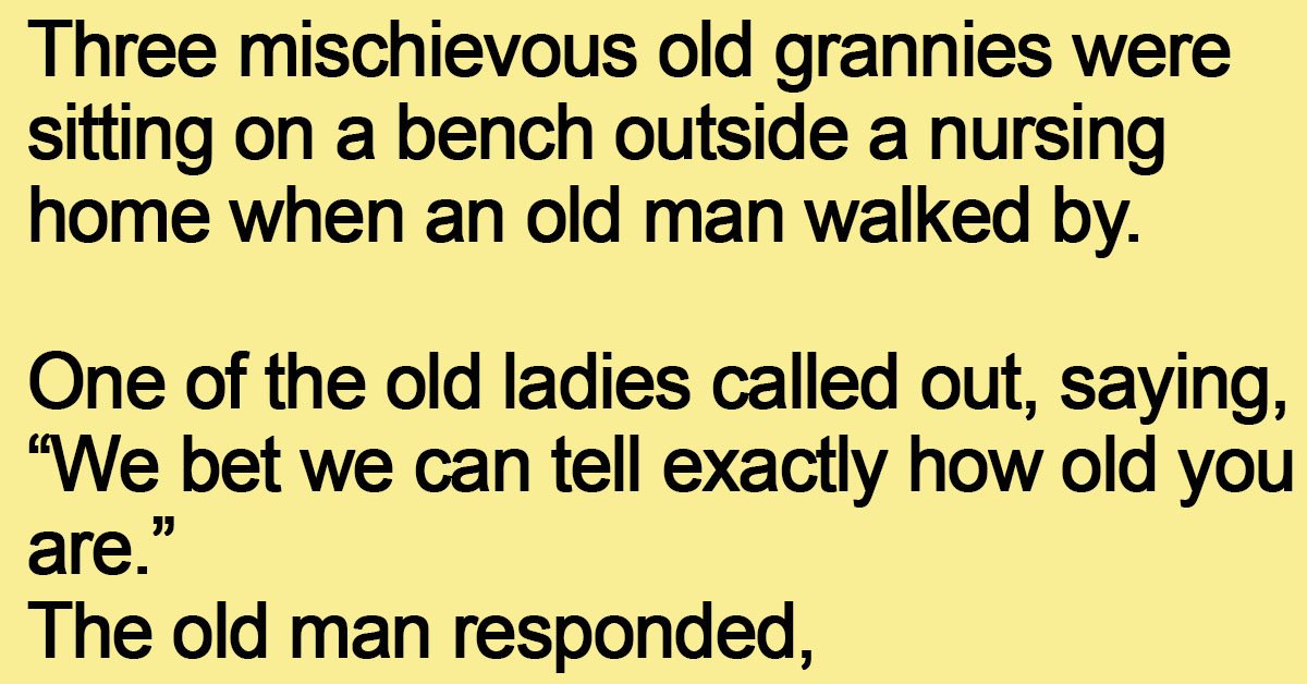 Three mischievous old grannies were sitting on a bench outside a nursing home when an old man walked by. One of the old ladies called out, saying, “We bet we … …