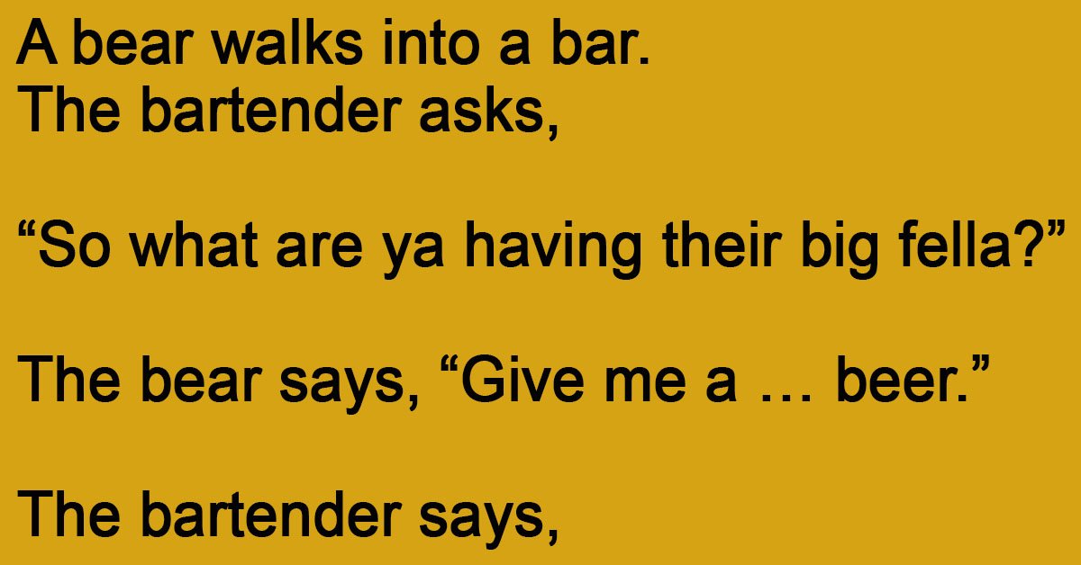 A bear walks into a bar. The bartender asks, “So what are ya having their big fella?” The bear says, “Give me a … beer.” The bartender says, “What’s with … …