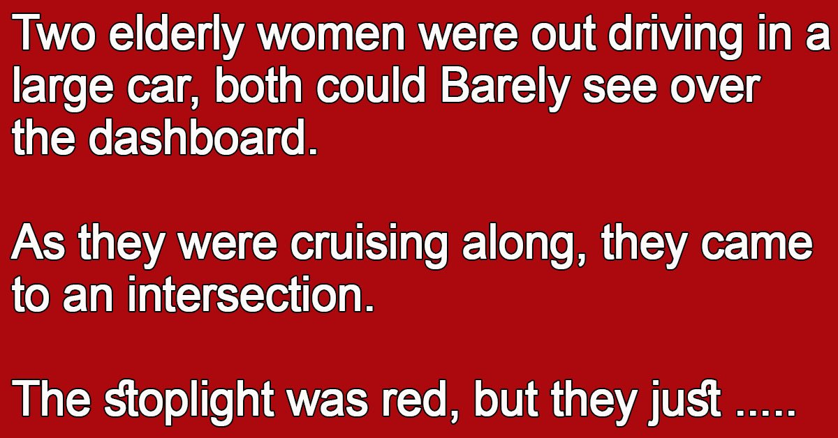 Two elderly women were out driving in a large car, both could Barely see over the dashboard. As they were cruising along, they came to an intersection. The stoplight was … …