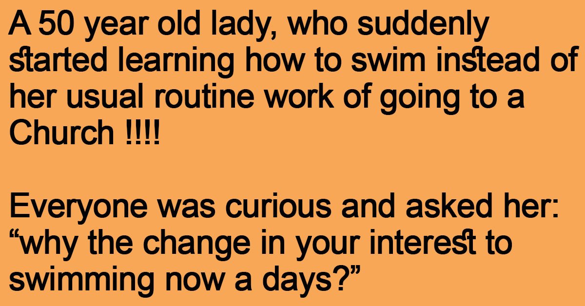 A 50 year old lady, who suddenly started learning how to swim instead of her usual routine work of going to a Church !!!! Everyone was curious and asked her: … …