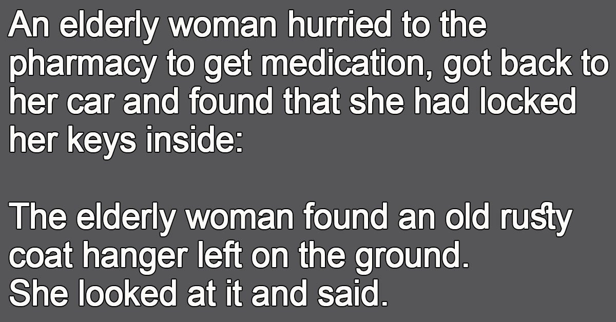 An elderly woman hurried to the pharmacy to get medication, got back to her car and found that she had locked her keys inside: The elderly woman found an old … …
