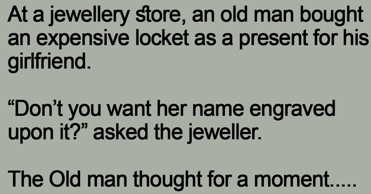 At a jewellery store, an old man bought an expensive locket as a present for his girlfriend. “Don’t you want her name engraved upon it?” asked the jeweller. The Old … …