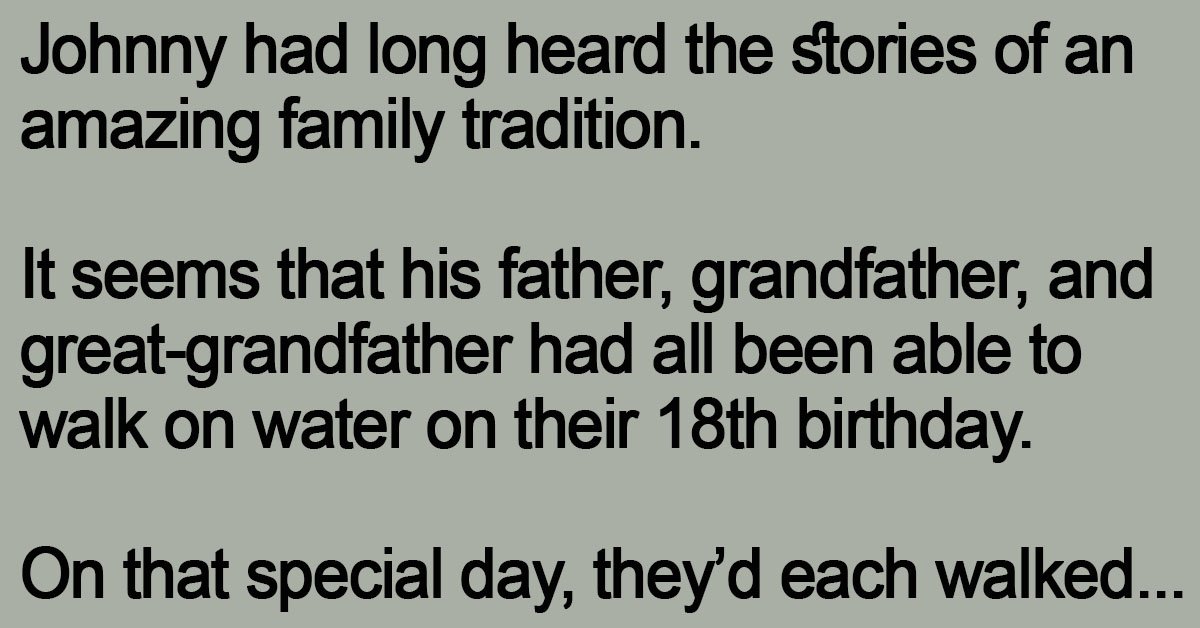 Johnny had long heard the stories of an amazing family tradition. It seems that his father, grandfather, and great-grandfather had all been able to walk on water on their 18th … …