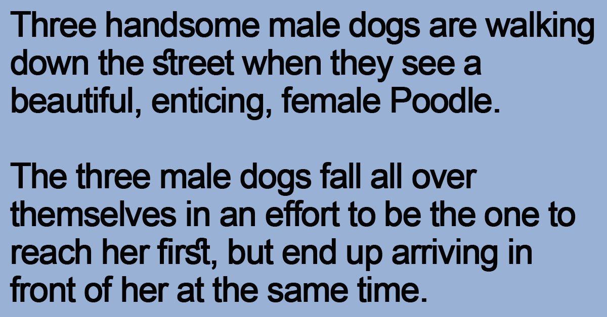 Three handsome male dogs are walking down the street when they see a beautiful, enticing, female Poodle. The three male dogs fall all over themselves in an effort to be … …