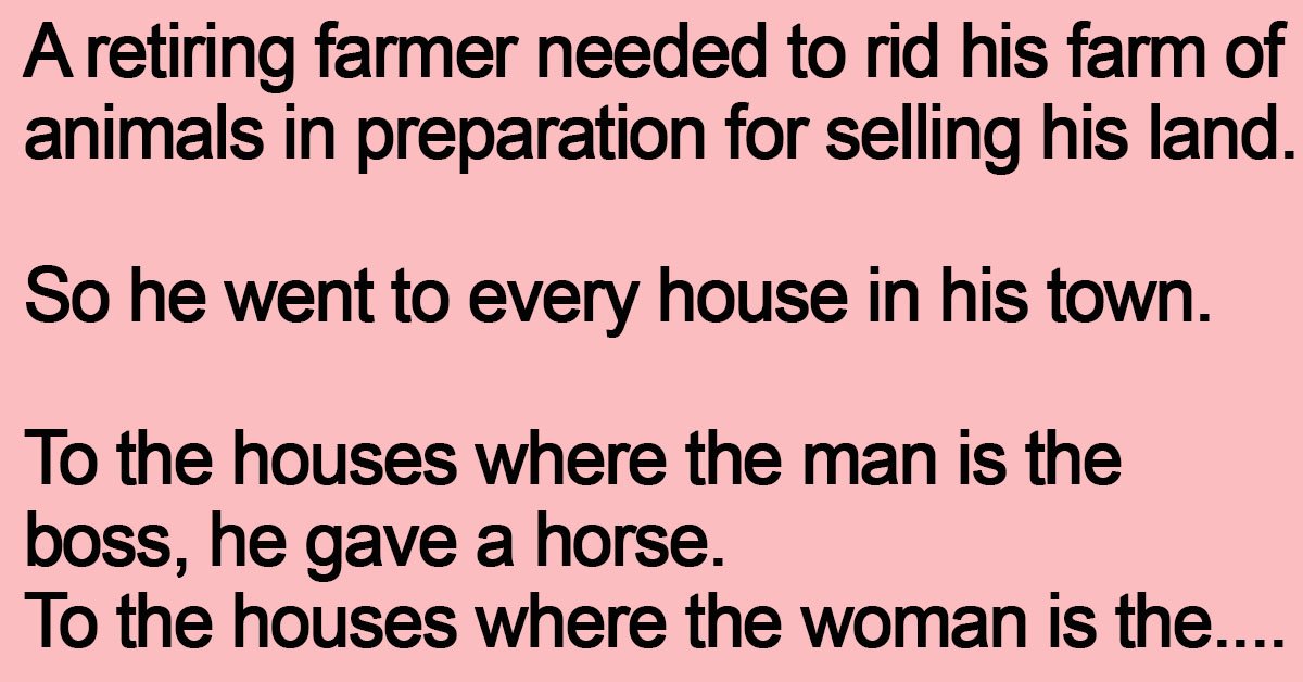 A retiring farmer needed to rid his farm of animals in preparation for selling his land. So he went to every house in his town. To the houses where the … …