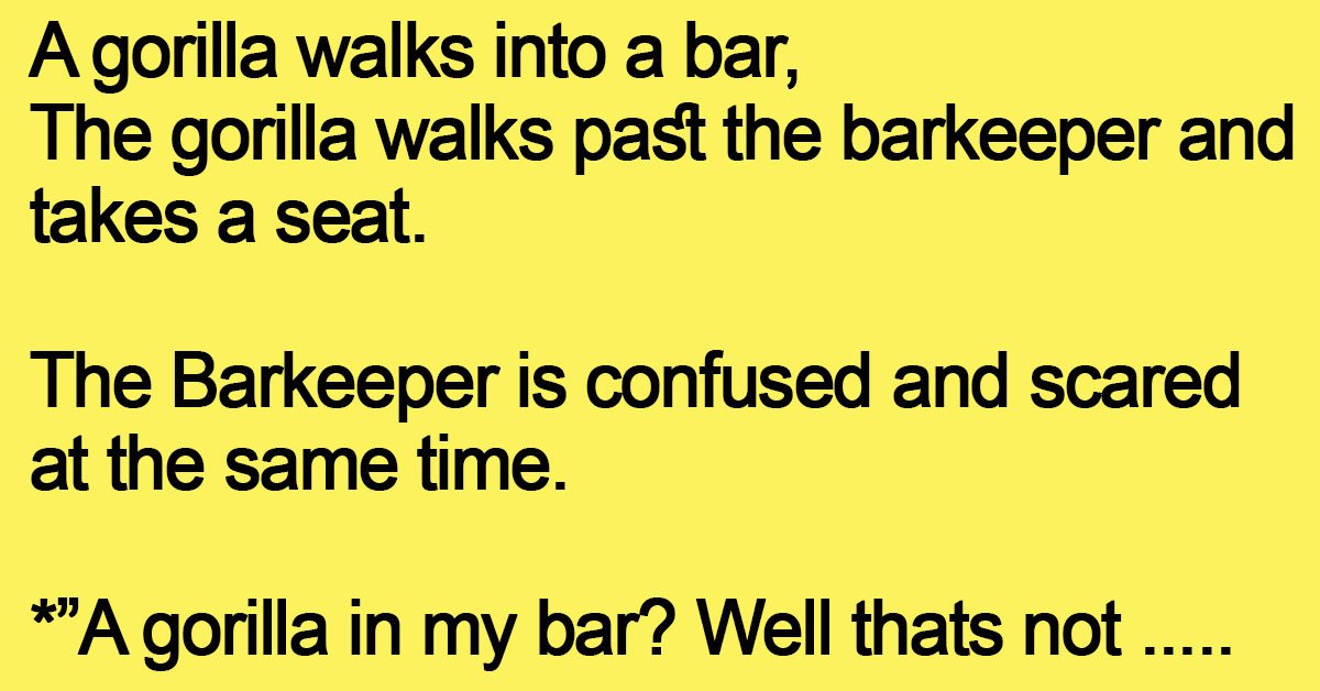 A gorilla walks into a bar The gorilla walks past the barkeeper and takes a seat. The Barkeeper is confused and scared at the same time. *”A gorilla in my … …