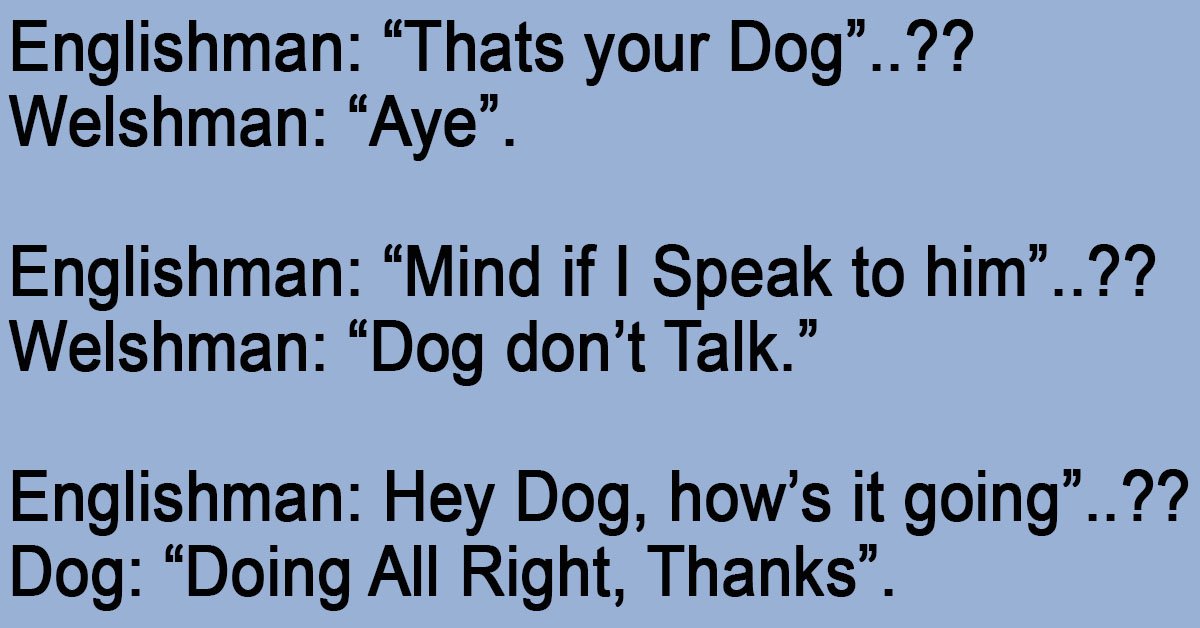 Englishman: “Thats your Dog”..?? Welshman: “Aye”. Englishman: “Mind if I Speak to him”..?? Welshman: “Dog don’t Talk.” Englishman: Hey Dog, how’s it going”..?? Dog: “Doing All Right, Thanks”. Welshman: (Look … …