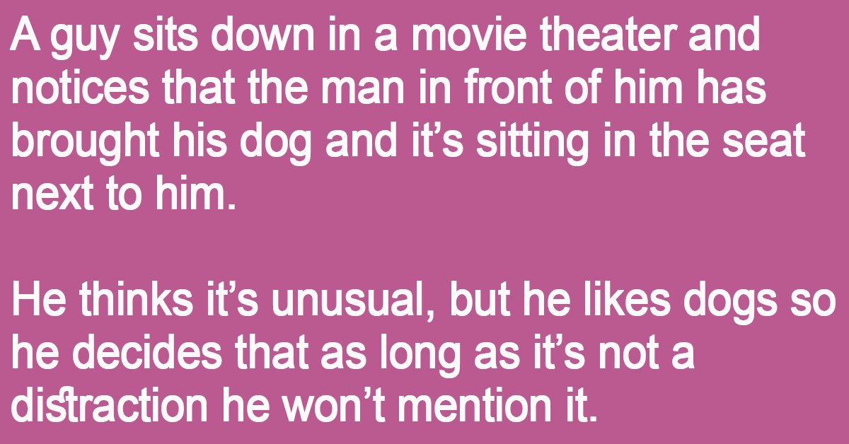A guy sits down in a movie theater and notices that the man in front of him has brought his dog and it’s sitting in the seat next to … …